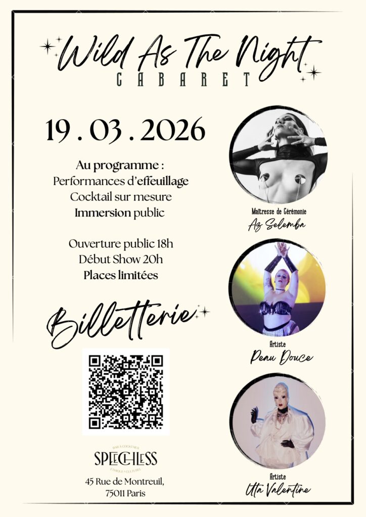 Retrouvez nous le jeudi 19 mars 2026 pour la troisième édition du Wild As The Night Cabaret au Speechless Bar.