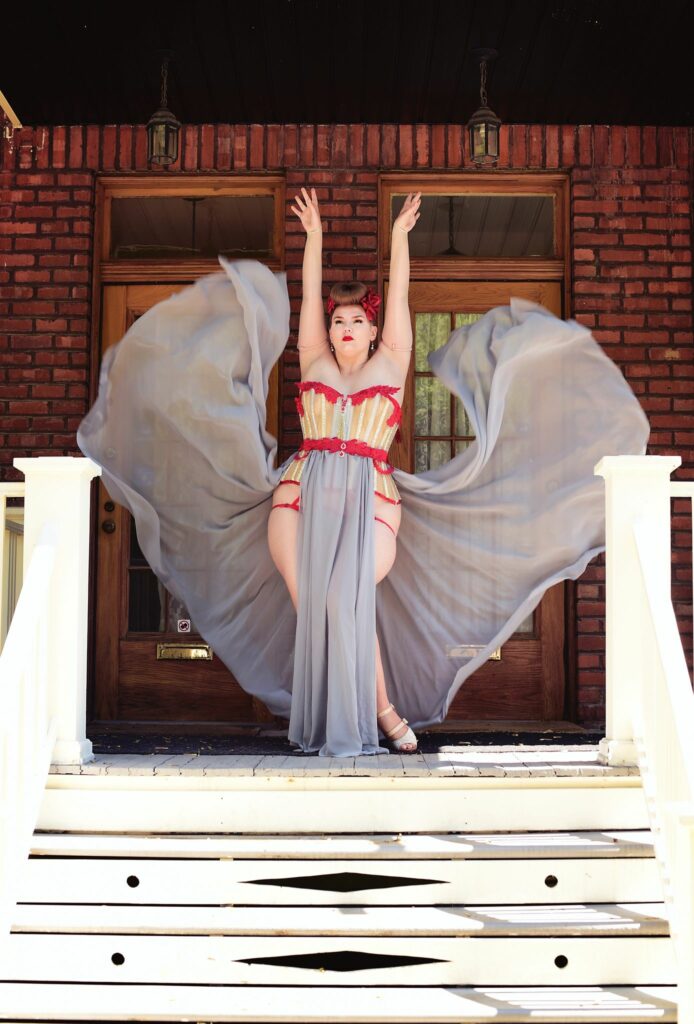 Portrait Sucre à la Crème effeuilleuse burlesque Montréal fond rouge lèvres rouges boucles d’oreilles pendantes